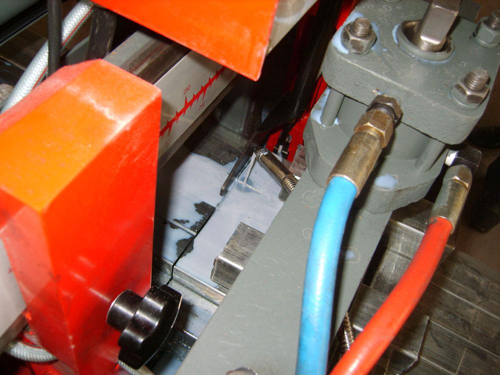 ④鋼刷傳動裝置,采用隨主傳動連動的主動傳動,有效的刷去鋸齒上的鋸屑,避免了由于粘屑而造成的打齒現(xiàn)象;鋼刷與鋸條的位置可隨鋼刷的磨損隨時調節(jié),延長了鋸條壽命。